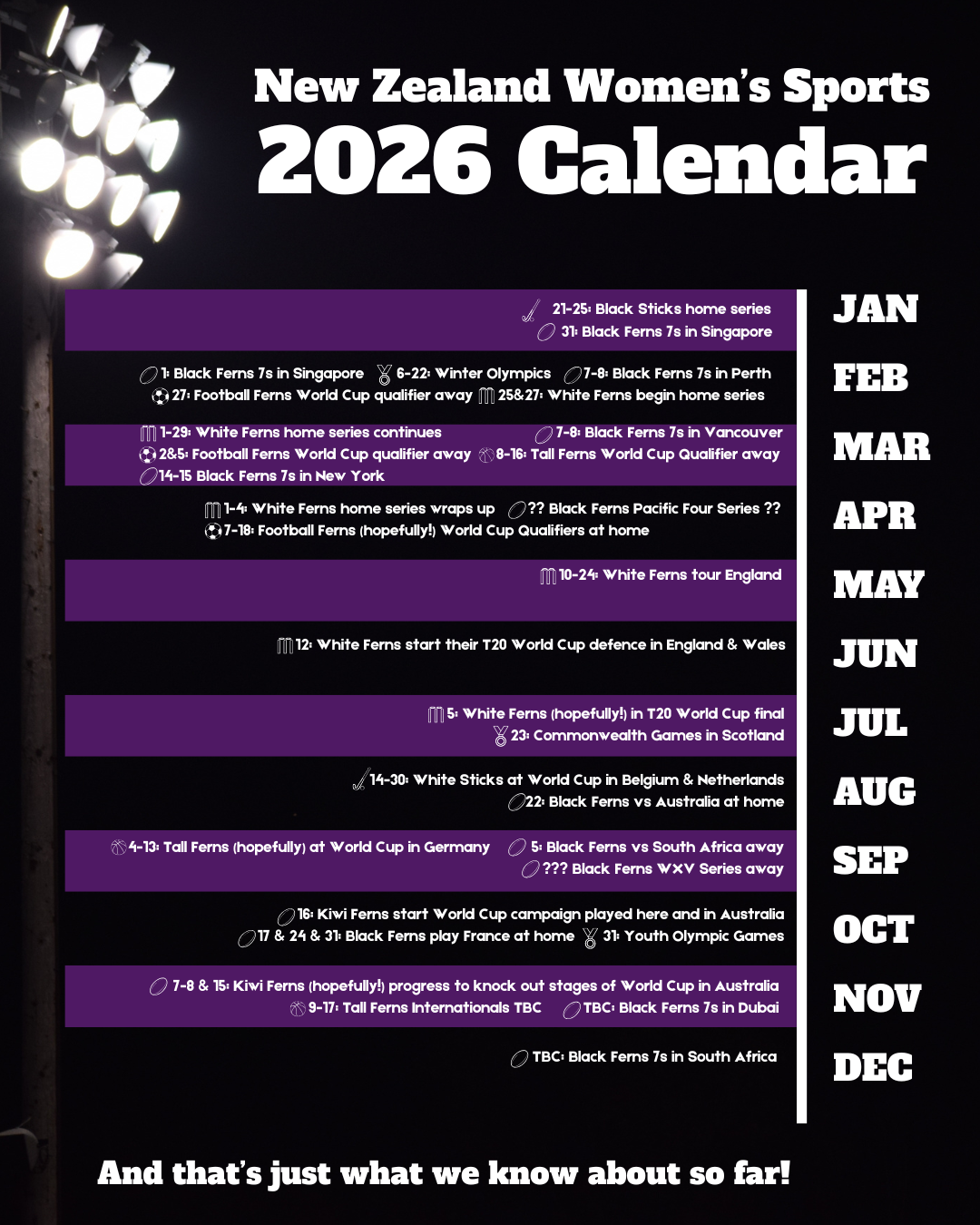 Hopefully we are watching our Kiwi Fern in the Rugby League World Cup final at the beginning of November after having watched this current government being voted out (MANIFEST WITH ME!). These next two months we start hitting TBC territory cause women’s sport can’t do that type of detail this far out. The Sevens series WILL resume we just aren’t exactly sure which weekend.