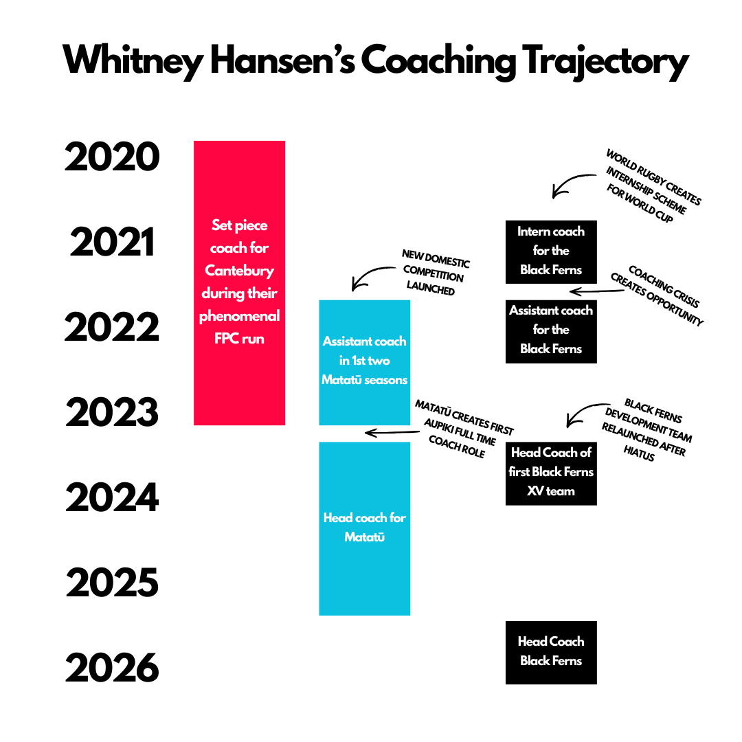 The best news story for women in coaching in Aotearoa in 2025 was the announcement of Whitney Hansen as the new Black Ferns head coach. A coach who had committed herself to developing within the women's game was able to ascend to our countries highest position.