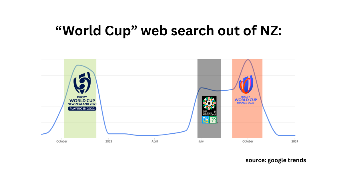 Meanwhile the web search data for "World Cup" out of New Zealand over this period show the audience was there. Despite peaking in searches just behind the men's Rugby World Cup the following year, coverage between the two tournaments simply doesn't compare. Our home tournament gaining 3.9% of the total sports news coverage in 2022 while the men's tournament in France gained 10.5% a year later.