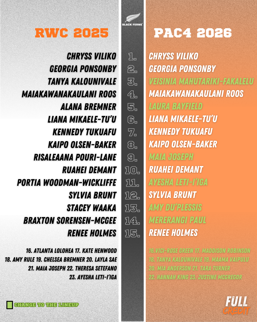 It's the first time they face off since the Black Ferns had no answer in 2025. The teams they have named for Saturday have rung in the changes. They are spread across the starting line up and both teams have entirely new benches. The points of interest for me though are at halfback and back row.